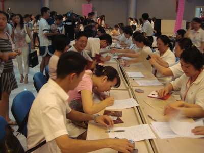 Pequim escolheu o dia 8 de agosto de 2008 para a abertura dos Jogos Olímpicos porque o 8 é o número que representa a prosperidade (explica-se:”ba” é o mesmo som para o 8 e para a palavra riqueza). Esse foi também o dia escolhido por 16 mil casais pequineses para celebrar o casamento. Fui até um cartório no bairro de Chaoyang. Só ali eram 3 mil casais inscritos. Tanta gente que o cartório teve que alugar o auditório do hospital do outro lado da rua. Os casais foram divididos em turmas, das 6 da manhã ao meio-dia. Os números das senhas foram colocados num painel cor-de-rosa, que servia também de cenário para as primeiras fotografias dos pombinhos.
