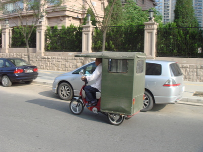 Duas cenas típicas nas ruas de Pequim. A primeira são os triciclos elétricos, com “cabine”, que andam de um lado para o outro. Muitos deles servem como transporte alternativo. Ficam estacionados em saídas de metrô e levam passageiros apressados até determinado ponto perto dali. A corrida sai por 1 ou 2 yuans (R$ 0,25 a R$ 0,50).