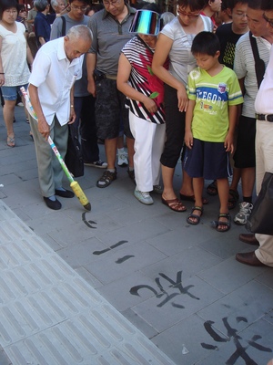 A segunda cena é dos velhinhos que andam com suas “canetas chinesas”, escrevendo mensagens positivas nas calçadas. Na verdade, ele escreve com água. Depois de um ou dois minutos, a água evapora e a mensagem desaparece.