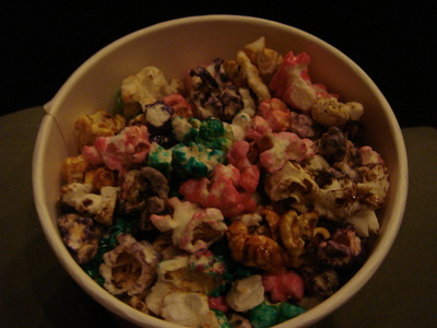 O que se come no cinema? Comprei um pacote pequeno de pipoca doce (15 yuans). Não há salgada. Na verdade, a pipoca era toda colorida e cada cor tinha um sabor – vermelha, cereja; marrom, chocolate; azul, não descobri.